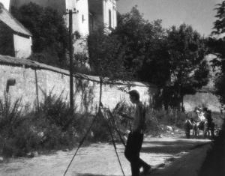 Fotografia przedstawia artystę podczas pleneru malarskiego przy klasztorze oo. franciszkanów na ulicy Plebanka w Kazimierzu Dolnym. ; Materiał przekazany Ośrodkowi "Brama Grodzka - Teatr NN" przez Ewę Hartwig-Fijałkowską. ; Odbitka fotograficzna wykonana w latach powojennych.