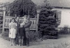 Uratowana Lidia Hobbs (Damm) (z lewej) z przybranym rodzeństwem i Eufrozyną i Edwardem Trzeciakami, odznaczonymi medalem Sprawiedliwy wśród Narodów Świata, przed Leśniczówką w Brzozowicy. ; Die Familie und Lidia Hobbs (Damm) (auf der linken Seite) vor der Försterei.